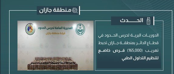 أحبطت الدوريات البرية لحرس الحدود في قطاع الدائر بمنطقة جازان تهريب (165,000) قرص خاضع لتنظيم التداول الطبي، واستكملت الإجراءات النظامية الأولية، وسُلّمت المضبوطات لجهة الاختصاص.