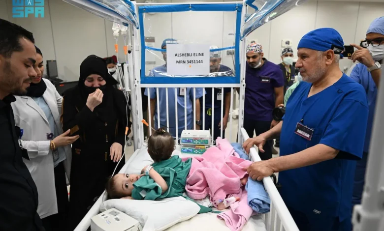 وأبان أن التوأم الملتصق السوري، قد وصلتا إلى المملكة العربية السعودية بتاريخ 29 ديسمبر 2024م بالتعاون مع وزارتي الخارجية، والدفاع، وتم إدخالهما مستشفى الملك عبدالله التخصصي للأطفال بوزارة الحرس الوطني، وبعد عدة اجتماعات للفريق الطبي وإجراء فحوصات موسعة ودقيقة للتوأم، تبين أنهما تلتصقان في منطقة أسفل الصدر والبطن، وتشتركان بغشاء القلب والكبد مع احتمال اشتراكهما أيضًا بالأمعاء، وقرر الفريق الطبي بناءً على ذلك إجراء عملية لتمديد الجلد بوضع بالونات طبية تحت الجلد لتكبير حجمه ليتمكن الفريق الجراحي من تغطية الجراح بعد فصلهما، مفيدًا أن العملية تستغرق قرابة (9) ساعات وتُنفذ على (6) مراحل، بمشاركة (24) من الأطباء الاستشاريين والمختصين، إلى جانب الكوادر التمريضية والفنية في تخصصات التخدير، وجراحة الأطفال، وجراحة التجميل، وغيرها من التخصصات المساندة.