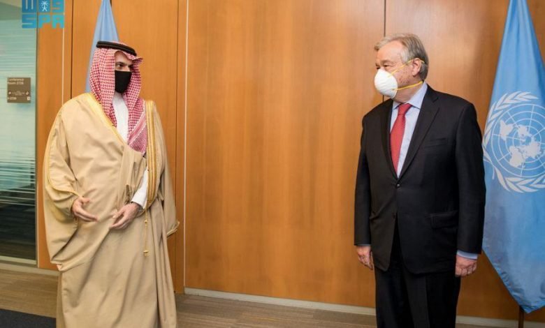 الأمير فيصل بن فرحان يستعرض مع الأمين العام للأمم المتحدة آخر المستجدات والتطورات في فلسطين