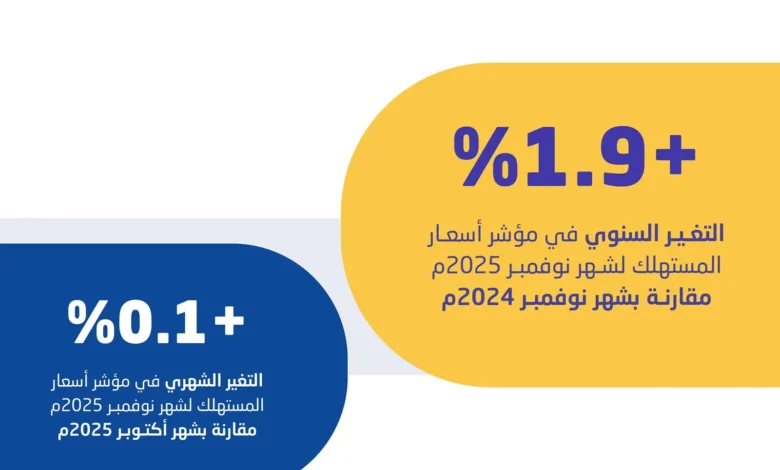 سجَّل معدل التضخم السنوي لمؤشر أسعار المستهلك في المملكة نسبة 1.9% خلال شهر نوفمبر 2025م مقارنة بنوفمبر 2024م في حين شهد المؤشر استقرارًا نسبيًا على أساس شهري بنسبة 0.1% مقارنة بشهر أكتوبر 2025م.