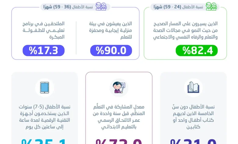 يذكر أن إحصاءات تنمية الطفولة المبكرة ورفاهية الطفل تستند إلى بيانات مسح صحة المرأة والطفل لعام 2025م والبيانات السجلية لوزارة التعليم للعام الدراسي (2024-2025)، وتُعد من أبرز المؤشرات التي تعكس واقع تنمية الطفولة المبكرة في المملكة وتُستخدم لدعم السياسات الوطنية، وتحسين جودة الحياة للأطفال في مراحلهم الأولى.