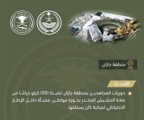 صرح المتحدث الرسمي للإدارة العامة للمجاهدين عبدالمجيد الكنعان، بأن دوريات المجاهدين بمنطقة جازان ضبطت (50) كيلو جرامًا من مادة الحشيش المخدر بحوزة مواطن، مخبأة داخل الإطار الاحتياطي لمركبة كان يستقلها، وجرى إيقافه واتخذت بحقه الإجراءات النظامية الأولية وإحالته لجهة الاختصاص.