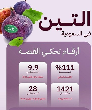أكدت وزارة البيئة والمياه والزراعة، أن المملكة تحقق الاكتفاء الذاتي من فاكهة التين بنسبة (111%)، وبكميات إنتاج سنوي تتجاوز (28) ألف طن في مساحة مزروعة تبلغ نحو (1,421) هكتارًا في مختلف مناطق المملكة.