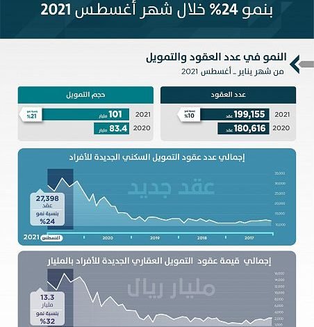 وسجّلت الأشهر الماضية من العام الجاري (من شهر يناير حتى شهر أغسطس 2021) 199,155 عقدًا مقدمة من جميع المصارف والشركات التمويلية، بقيمة 101 مليار ريال بنمو 10% في عدد العقود و21% في التمويل، مقارنة بنفس الفترة من العام الماضي 2020 التي سجلت 180,616عقدًا بقيمة تجاوزت 83.4 مليار ريال.