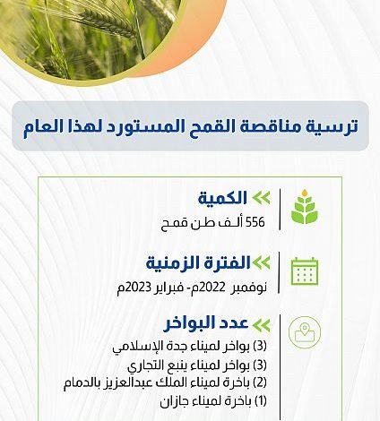 أنهت المؤسسة العامة للحبوب إجراءات ترسية الدفعة الرابعة من القمح المستورد لهذا العام (2022م) بكمية (556) ألف طن للتوريد من مناشئ أوروبا، وأمريكا الشمالية والجنوبية، وأستراليا، والبحر الأسود.