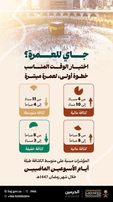 وأكدت الوزارة أن اختيار الوقت المناسب يُعد خطوة أولى لعمرة ميسّرة، داعية المعتمرين إلى الاستفادة من فترات الكثافة الخفيفة قدر الإمكان.