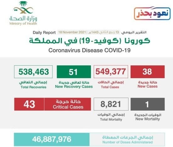 وبيّنت الإحصائية أن إجمالي الإصابات بلغ 549377 حالة، وبلغت حالات التعافي 538463 حالة، ووصل إجمالي الوفيات 8821 حالة -رحمهم الله-، فيما بلغت الحالات الحرجة 43 حالة.