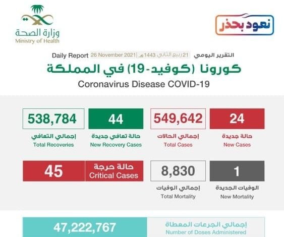 وبينت الإحصائية أن إجمالي عدد الإصابات في المملكة بلغ (549642) حالة وبلغ عدد حالات التعافي (538784) حالة.