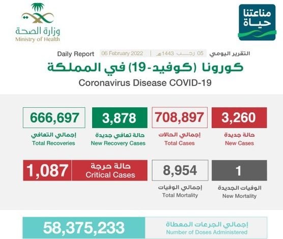 سجلت وزارة الصحة خلال الـ 24 ساعة الماضية, (3260) إصابة جديدة بفيروس كورونا, وتعافي (3878) حالة, والحالات الحرجة (1087)، وحالة وفاة واحدة.