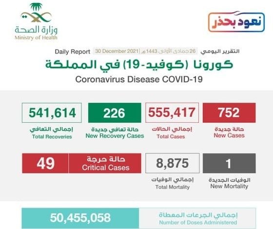 أعلنت وزارة الصحة إحصائية جديدة لمستجدات كورونا في المملكة خلال الـ 24 ساعة الماضية تضمنت تسجيل (752) حالة مؤكدة مصابة بكورونا وتعافي (226) حالة فيما بلغ عدد الحالات الحرجة (49) حالة.