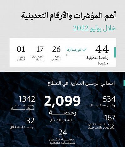 كشفت وزارة الصناعة والثروة المعدنية عن إصدار 44 رخصة تعدينية جديدة خلال شهر يوليو الماضي، ليصبح إجمالي الرخص التعدينية السارية في قطاع التعدين في المملكة نحو 2099 رخصة، تتصدرها رخص محاجر مواد البناء بـ1,342 رخصة، تليها رخص الكشف بـ534 رخصة، ثم رخص الاستغلال بنحو 167، و32 رخصة استطلاع و24 رخصة فائض خامات معدنية.