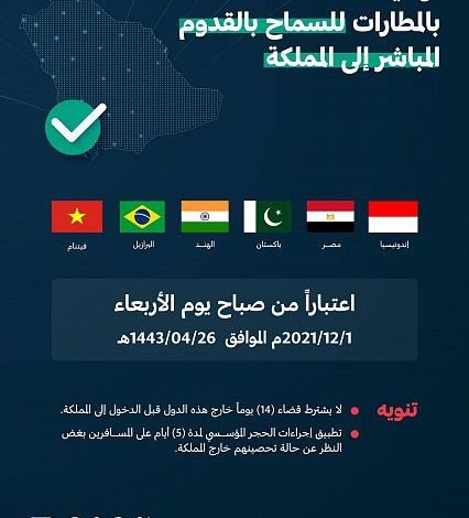 أصدرت الهيئة العامة للطيران المدني تعليماتها إلى جميع شركات الطيران العاملة بمطارات المملكة، بشأن رفع تعليق القدوم المباشر إلى المملكة العربية السعودية عن بعض الدول المعلق القدوم منها وهي (جمهورية إندونيسيا، جمهورية باكستان الإسلامية، جمهورية البرازيل الاتحادية، جمهورية فيتنام الاشتراكية، جمهورية مصر العربية، جمهورية الهند)، وذلك دون الحاجة إلى قضاء (14) يوماً خارج هذه الدول قبل الدخول إلى المملكة، مع تطبيق إجراءات الحجر المؤسسي لمدة (5) أيام على المسافرين بغض النظر عن حالة تحصينهم خارج المملكة، مع استمرار تطبيق الاستثناءات الصادرة بشأن بعض الفئات في هذا الخصوص.