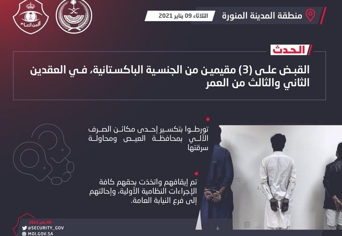 صرّح المتحدث الإعلامي لشرطة منطقة المدينة المنورة المقدم حسين القحطاني، بأن المتابعة الأمنية لجرائم الاعتداء على الأموال وتعقب مرتكبيها، أسفرت – بفضل الله – عن تمكن شرطة العيص من القبض على (3) مقيمين من الجنسية الباكستانية، في العقدين الثاني والثالث من العمر، لتورطهم بتكسير إحدى مكائن الصرف الآلي بالمحافظة ومحاولة سرقتها، وقد جرى إيقافهم واتخذت بحقهم كافة الإجراءات النظامية الأولية، وإحالتهم إلى فرع النيابة العامة.
