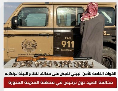 تمكنت الدوريات الميدانية للقوات الخاصة للأمن البيئي وهي تؤدي مهامها في تنفيذ نظام البيئة في منطقة المدينة المنورة من القبض على المواطن وهو نايف محمد عايد المطيري، لارتكابه مخالفة الصيد دون ترخيص، بحوزته بندقية هوائية، و(13) ذخيرة هوائية، و(29) كائنًا فطريًا مصيدًا، وجرى إيقافه واتخاذ الإجراءات النظامية بحقه، وإحالته إلى الجهة المختصة.