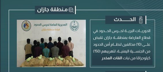 قبضت الدوريات البرية لحرس الحدود في قطاع العارضة بمنطقة جازان على (10) مخالفين لنظام أمن الحدود من الجنسية اليمنية، لتهريبهم (150) كيلوجرامًا من نبات القات المخدر، وجرى استكمال الإجراءات النظامية الأولية بحقهم، وتسليمهم والمضبوطات لجهة الاختصاص.