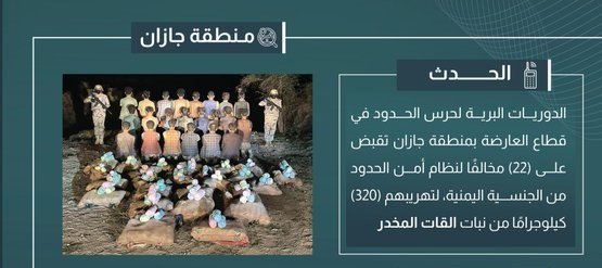 قبضت الدوريات البرية لحرس الحدود في قطاع العارضة بمنطقة جازان على (22) مخالفًا لنظام أمن الحدود من الجنسية اليمنية، لتهريبهم (320) كيلوجرامًا من نبات القات المخدر، واستكملت الإجراءات النظامية الأولية بحقهم، وسُلّموا والمضبوطات لجهة الاختصاص.