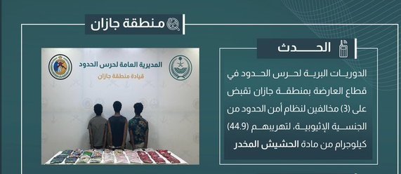 قبضت الدوريات البرية لحرس الحدود في قطاع العارضة بمنطقة جازان على (3) مخالفين لنظام أمن الحدود من الجنسية الإثيوبية، لتهريبهم (44.9) كيلوجرامًا من مادة الحشيش المخدر، واستكملت الإجراءات النظامية الأولية بحقهم، وسُلّموا والمضبوطات لجهة الاختصاص.