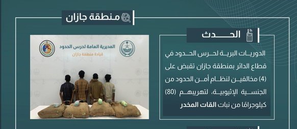 قبضت الدوريات البرية لحرس الحدود في قطاع الدائر بمنطقة جازان على (4) مخالفين لنظام أمن الحدود من الجنسية الإثيوبية، لتهريبهم (80) كلجم من نبات القات المخدر، وجرى استكمال الإجراءات النظامية الأولية بحقهم، وتسليمهم والمضبوطات لجهة الاختصاص.