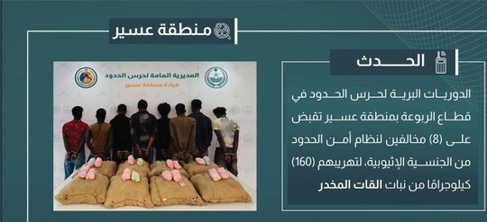 قبضت الدوريات البرية لحرس الحدود في قطاع الربوعة بمنطقة عسير على (8) مخالفين لنظام أمن الحدود من الجنسية الإثيوبية، لتهريبهم (160) كيلوجرامًا من نبات القات المخدر، وجرى استكمال الإجراءات النظامية الأولية بحقهم، وتسليمهم والمضبوطات لجهة الاختصاص.