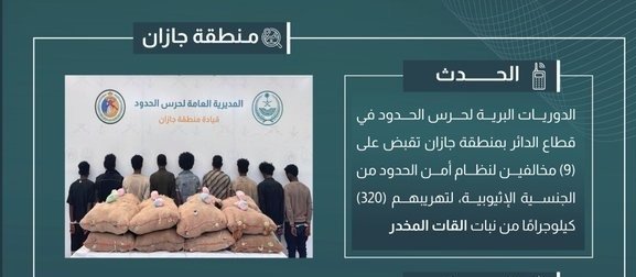 قبضت الدوريات البرية لحرس الحدود في قطاع الدائر بمنطقة جازان، على (9) مخالفين لنظام أمن الحدود من الجنسية الإثيوبية، لتهريبهم (320) كيلوجرامًا من نبات القات المخدر، وجرى استكمال الإجراءات النظامية الأولية بحقهم، وتسليمهم والمضبوطات لجهة الاختصاص.