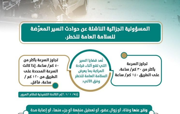 أكدت النيابة العامة أن تجاوز السرعة المسموح بها أثناء قيادة المركبات بما يعرض السلامة العامة للخطر تترتب عليه المساءلة الجزائية ، ويشمل ذلك تجاوز السرعة بأكثر من 30 كلم في الساعة على طريق 140 كلم في الساعة، وكذلك تجاوز السرعة بأكثر من 5-كلم في الساعة على طريق سرعته محددة بـ 12- كلم في الساعة أو أقل، ونتج عن ذلك وفاة أو زوال عضو أو تعطيل منفعة أو إصابة تزيد مدة الشفاء منها عن 21 يوماً.