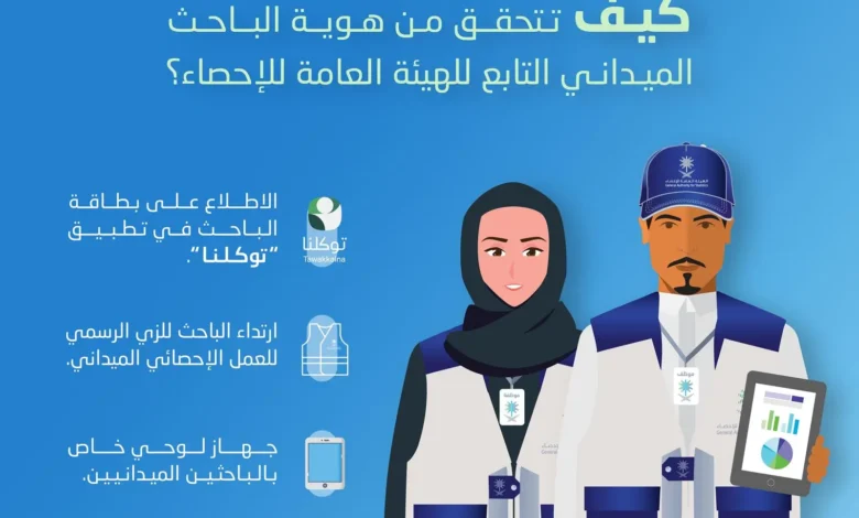 وجاءت هذه الخطوة في إطار سعي الهيئة العامة للإحصاء إلى القيام على الوجه الأكمل بدورها الوطني المتمثل في تنفيذ العديد من المسوح الميدانية، وإنتاج المؤشرات الإحصائية، من خلال الاستعانة بالباحثين الميدانيين لجمع البيانات المطلوبة، عبر زيارة العينات الإحصائية، سواءً كانت أسرًا أو منشآت، وفق ما يقتضيه نظام العمل الإحصائي في المملكة، مبينةً أنه يمكن التحقَّق من الباحثين الميدانيين وفق خطوات متعددة، هي: ارتداء الزي الرسمي المخصص للعمل الميداني، إبراز بطاقة التعريف الرقمية عبر تطبيق توكلنا، حمل الجهاز اللوحي المخصص لتسجيل المعلومات.