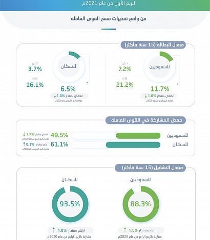 أصدرت الهيئة العامة للإحصاء (GASTAT)، نشرة سوق العمل للربع الأول من عام 2021م، وذلك وفقًا لتقديرات مسح القوى العاملة الذي تُجْريه الهيئة بشكل ربع سنوي، حيث أظهرت النتائج انخفاض معدل بطالة إجمالي السكان السعوديين وغير السعوديين (15سنة فأكثر) من واقع تقديرات مسح القوى العاملة للربع الأول من عام 2021م لتصل إلى (6.5%) مقارنةً بـ (7.4%) خلال الربع السابق (الربع الرابع من عام 2020م)، فيما انخفض معدل البطالة لإجمالي السعوديين (الذكور والإناث 15سنة فأكثر) إذ بلغ (11.7%) في الربع الأول من عام 2021م، مقارنةً بـ (12.6%) خلال الربع السابق.