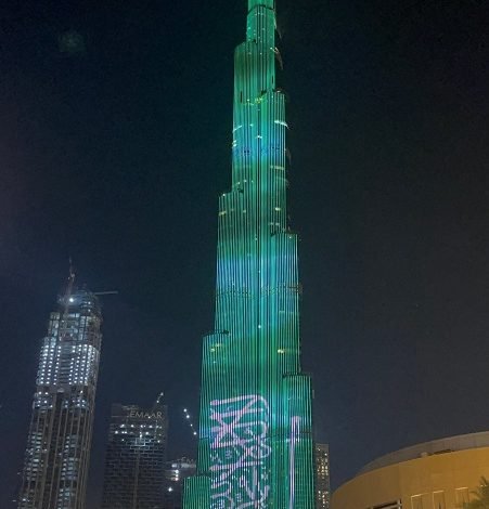 برج خليفة يتوشح بعلم المملكة بمناسبة اليوم الوطني