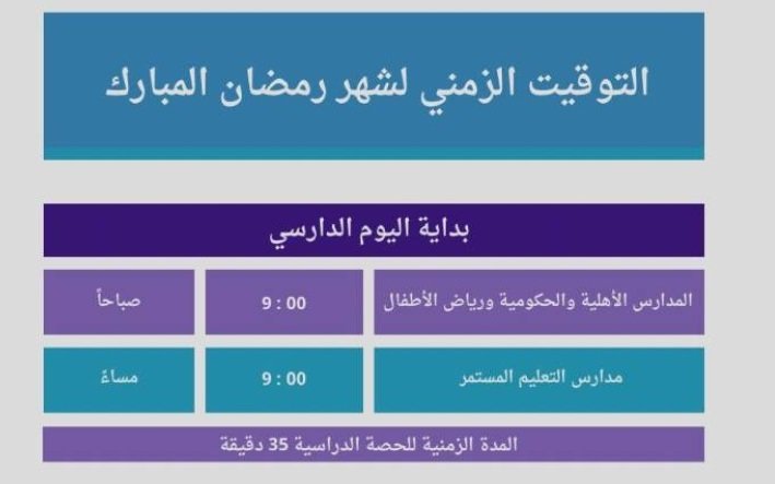 وأوضح المدير العام لإدارة تعليم الباحة الدكتور عبدالخالق بن حنش الزهراني، أن بداية الدوام الدراسي للمدارس الحكومية والأهلية ورياض الأطفال ستكون عند الساعة التاسعة صباحًا، فيما حُدد توقيت دوام التعليم المستمر ليبدأ عند الساعة التاسعة مساءً، على أن تكون مدة الحصة الدراسية (35) دقيقة طوال شهر رمضان.
