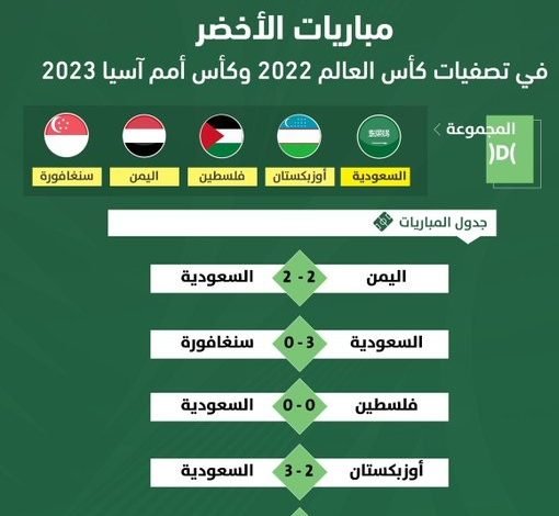 يذكر أن منتخب السعودية يحتل المركز الثاني في ترتيب المجموعة الرابعة بالتصفيات برصيد ثماني نقاط من أربعة لقاءات، بفارق نقطة خلف منتخب أوزبكستان (المتصدر)، الذي خاض خمس مباريات، في حين يتواجد المنتخب الفلسطيني في ذيل الترتيب بأربع نقاط من خمس مباريات.