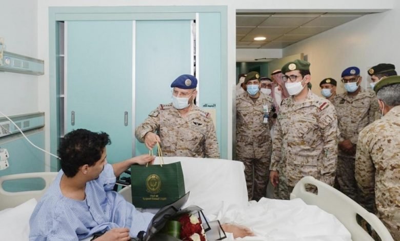 ونقل معاليه تحيات وتقدير خادم الحرمين الشريفين الملك سلمان بن عبدالعزيز آل سعود القائد الأعلى لكافة القوات العسكرية، وصاحب السمو الملكي الأمير محمد بن سلمان بن عبدالعزيز ولي العهد نائب رئيس مجلس الوزراء وزير الدفاع -حفظهما الله- مشيدًا بالتضحيات الغالية التى يقدمونها للدفاع والحفاظ على أمن واستقرار وسلامة الوطن، سائلاً الله عزوجل أن يمن عليهم بالشفاء العاجل والعودة لاستكمال مهامهم في الدفاع عن الوطن وصون مقدساته.