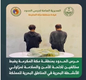 ضبطت الدوريات الساحلية لحرس الحدود في محافظة جدة بمنطقة مكة المكرمة مقيمين من الجنسية الميانمارية، مخالفين للائحة الأمن والسلامة لمزاولي الأنشطة البحرية في المناطق البحرية للمملكة العربية السعودية؛ وذلك لممارستهما الصيد دون تصريح، واستخدامهما أدوات محظورة، واتُخذت الإجراءات النظامية بحقهما بالتنسيق مع الجهات المختصة.