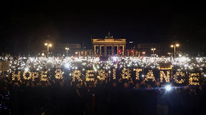 وأمام بوابة براندنبورج الشهيرة، أضاء المتظاهرون عند حلول الظلام هواتفهم المحمولة مشكلين كلمتي “أمل” و”مقاومة” بالإنجليزية.
