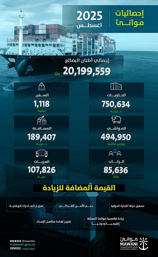 شهدت الموانئ السعودية التي تشرف عليها الهيئة العامة للموانئ “موانئ”، خلال شهر أغسطس 2025، ارتفاعًا في أعداد الحاويات المناولة بنسبة 9.52%، حيث بلغت 750.634 حاوية قياسية، مقارنة بـ685.414 حاوية في أغسطس من العام الماضي 2024.