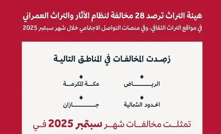 رصدت هيئة التراث خلال شهر سبتمبر عام 2025م (28) مخالفة تتعلق بنظام الآثار، وذلك ضمن أعمالها في الرقابة والمتابعة التي تنفذها لحماية مواقع التراث الثقافي والقطع الأثرية من أي تجاوزات، تطبيقًا للأنظمة والتعليمات ذات الصلة، وتعزيز الحضور الرقابي في مختلف مناطق المملكة.