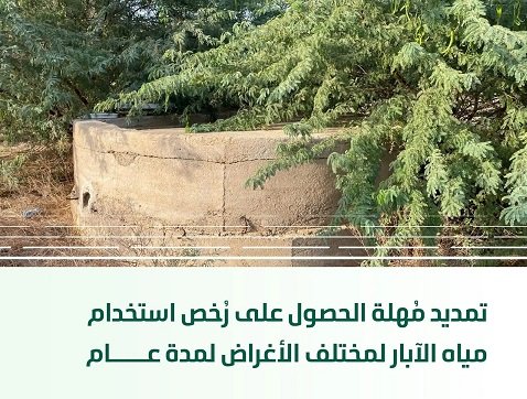 أعلنت وزارة البيئة والمياه والزراعة، تمديد مُهلة الحصول على رُخص استخدام مصادر المياه الجوفية (الآبار) لمختلف الأغراض، لمدة عامٍ واحد، ينتهي في 5 صفر 1448هـ؛ وذلك حرصًا على تيسير إجراءات حصول المستفيدين على الرخص، ومنحهم وقتًا إضافيًا لاستكمال طلباتهم، منوّهةً بأهمية الالتزام بالشروط والضوابط المنظمة.