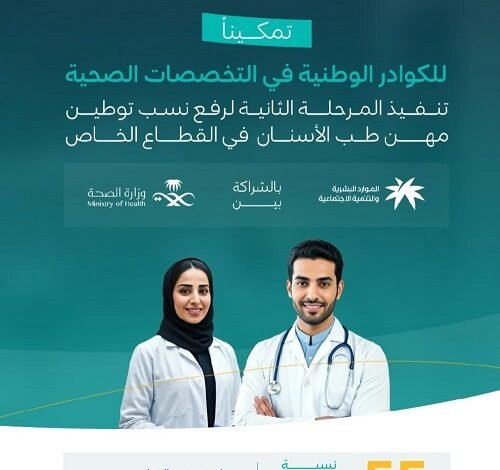 وأبانت أن المرحلة الثانية تطبق على جميع منشآت القطاع الخاص التي يعمل بها 3 عاملين فأكثر في تخصصات طب الأسنان بنسبة توطين 55%، ووفقاً للدليل الإجرائي، يشترط لاحتساب الطبيب السعودي ضمن نسب التوطين ألا يقل أجره الشهري المسجل في التأمينات الاجتماعية عن 9 آلاف ريال، مع ضرورة حصوله على الاعتماد المهني الساري من الهيئة السعودية للتخصصات الصحية.