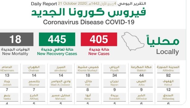أعلنت وزارة الصحة اليوم , عن تسجيل (405) حالات مؤكدة جديدة لفيروس كورونا الجديد (COVID -19) ليصبح عدد الحالات المؤكدة في المملكة (343373) حالة، من بينها (8423) حالة نشطة لاتزال تتلقى الرعاية الطبية، ومعظمهم حالتهم الصحية مطمئنة، منها (804) حالات حرجة، كما تم تسجيل (445) حالة تعافٍ جديدة، ليصل عدد المتعافين ولله الحمد إلى (329715) حالة.