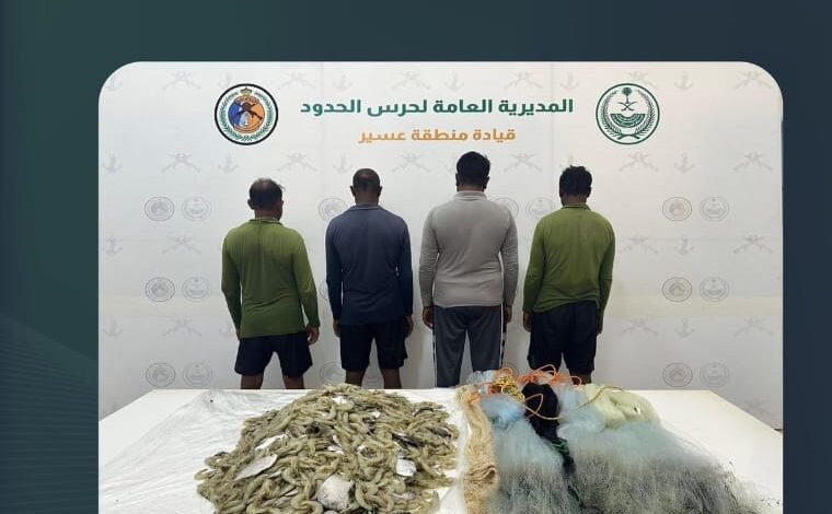 ضبطت الدوريات الساحلية لحرس الحدود في القحمة بمنطقة عسير (4) مقيمين من الجنسية البنجلاديشية مخالفين للائحة الأمن والسلامة لمزاولي الأنشطة البحرية في المناطق البحرية للمملكة العربية السعودية، وذلك لممارستهم الصيد دون تصريح، وبحوزتهم أسماك مصيدة، وتم اتخاذ الإجراءات النظامية بحقهم بالتنسيق مع الجهات المختصة.