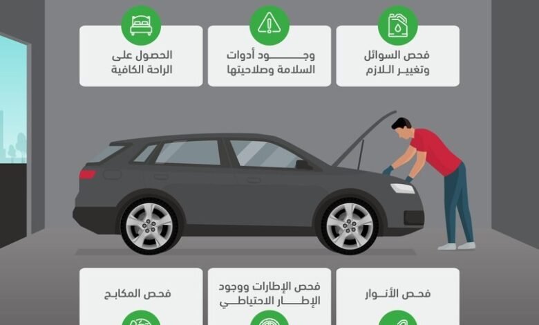 وقالت إدارة المرور في إنفوجراف توضيحي نشرته عبر حسابها الرسمي على منصة “إكس”: “قبل السفر بالمركبة تأكد من فحص السوائل وتغيير اللازم، وجود أدوات السلامة وصلاحيتها والحصول على الراحة الكافية”.