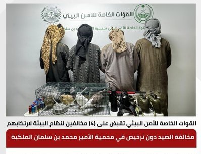 القبض على 4 مخالفين لنظام البيئة لارتكابهم مخالفة الصيد دون ترخيص في محمية الأمير محمد بن سلمان الملكية