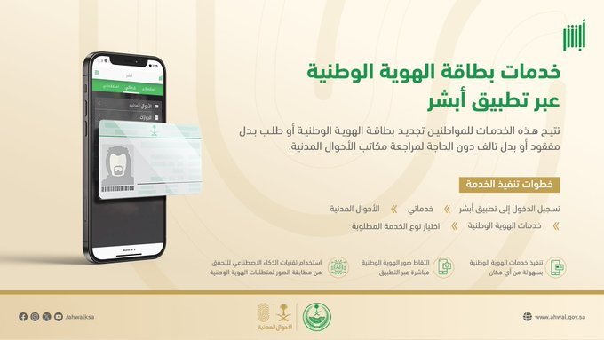 الأحوال المدنية توضح خدمات بطاقة الهوية الوطنية المتاحة عبر تطبيق «أبشر»