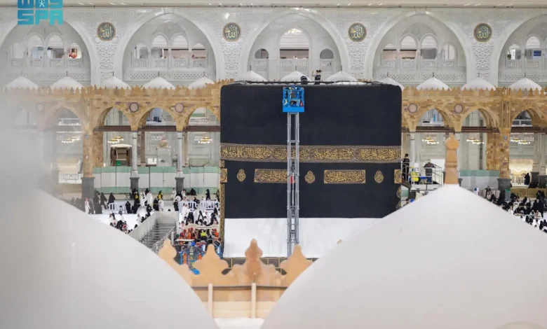 وشملت العملية فك الأجزاء السفلية للكسوة وفصل الأركان، ثم رفعها وتثبيتها على ارتفاع (3) أمتار، إلى جانب تثبيت القماش الأبيض وإعادة القناديل إلى مواقعها المخصصة، وفق إجراءات منظمة ودقيقة.