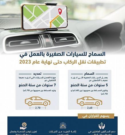 أعلنت الهيئة العامة للنقل السماح للسيارات الصغيرة التي تكون المسافة بين محوريها بين (2,60م) و (2,70م) بالعمل في تطبيقات نقل الركاب، على أن لا يزيد عمرها التشغيلي عن (5) سنوات من سنة الصنع، وتمديد فترة السماح للسيارات التي تزيد المسافة بين محوريها عن (2,70م) ولا يزيد عمرها التشغيلي عن (7) سنوات من سنة الصنع، بالعمل في نشاط تطبيقات نقل الركاب وذلك حتى نهاية العام الميلادي 2023م، على أن تقوم الشركات المرخصة بإضافة تصنيف خاص للسيارات الصغيرة وإيضاح الحد الأقصى لعدد الركاب في المركبة، والالتزام بعدم السماح لتلك المركبات بالعمل في المطارات وبين المدن.