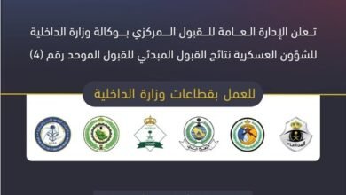 أعلنت الإدارة العامة للقبول المركزي بوكالة وزارة الداخلية للشؤون العسكرية، نتائج القبول المبدئي للقبول الموحد رقم (4) للعمل بقطاعات وزارة…