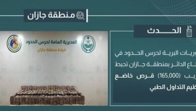 إحباط تهريب (165,000) قرص خاضع لتنظيم التداول الطبي بمنطقة جازان