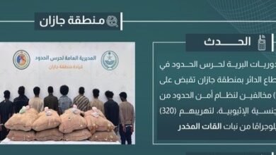 قبضت الدوريات البرية لحرس الحدود في قطاع الدائر بمنطقة جازان، على (9) مخالفين لنظام أمن الحدود من الجنسية الإثيوبية، لتهريبهم…